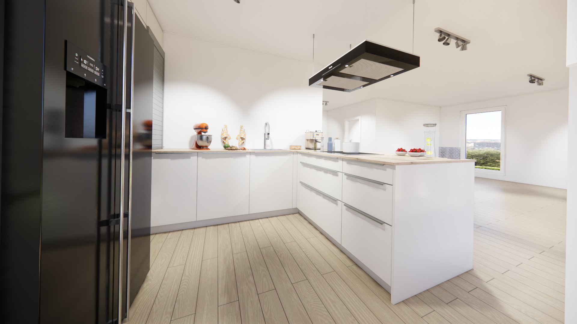Perfekte Stauraumnutzung, viel Arbeitsfläche, sparsame und leise Geräte, moderne Technik, pflegeleichte Oberflächen, schnittfeste Arbeitsplatten, nachhaltige Materialien, durchdachte Abläufe, selbstreinigende Backöfen, moderne Medientechnik, , …